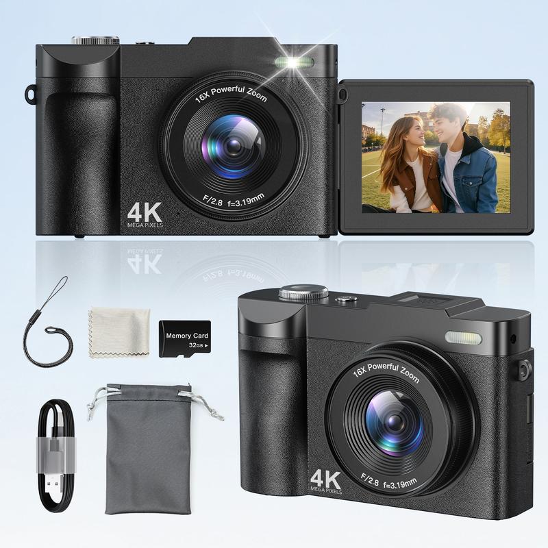 4K Digital Camera for Photography Autofocus, 50MP Vlogging Camera for Youtube with 32GB Card and 180° Flip Screen, 16X Zoom and 1500Mah Rechargeable Battery, Shoot Camera for Teens & Beginners (Black)