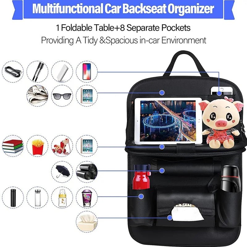 Car Seat Back Organizer with Foldable Table Tray PU Leather Storage Organizer Pockets Kick Mats Seat Interior Accessories