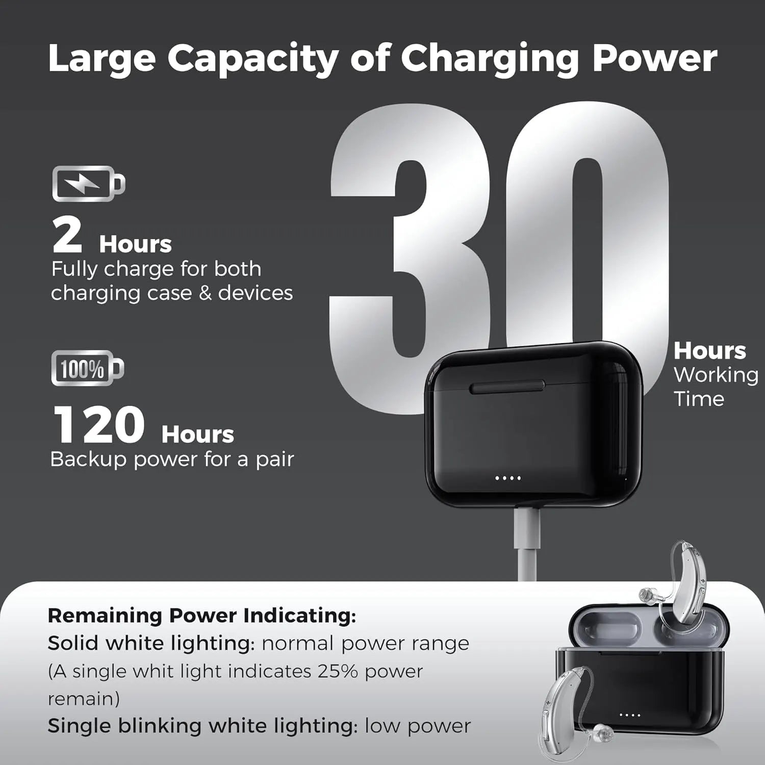3. Gran capacidad de energía de carga. Carga de 2 horas, funciona 25 horas, la caja de carga puede cargar los dispositivos de asistencia auditiva aproximadamente 4 veces, por lo que no tiene que preocuparse por quedarse sin energía durante actividades a largo plazo.