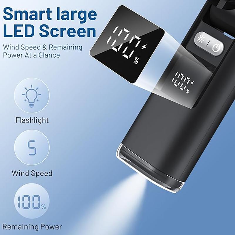 100 Speeds and Digital Display: Features 100 different speed settings for precise control, allowing customization from gentle breeze to powerful airflow. Letting you customize your comfort level perfectly. The handheld turbo fan features a high-definition digital display that displays gear wind and residual power in real time