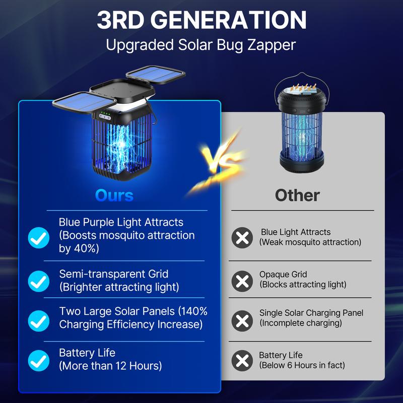 - Designed for versatile indoor and outdoor applications (patio, garden, camping, balcony), this solar-powered bug zapper charges in direct sunlight and operates fully automatically via smart light sensor. (Pro Tip: Place in unobstructed sunlight for optimal charging). In auto mode, it auto-turns off during daylight and activates at dusk for seamless mosquito control. For maximum efficiency, minimize surrounding ambient light to enhance insect attraction.